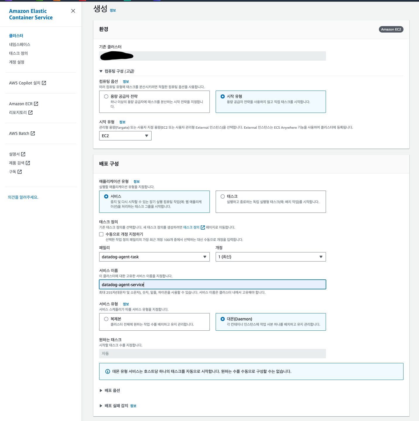공식문서는 memory를 256으로 세팅하는 json을 보여준다. 본 글에서는 512를 했다. 중요한 건 EC2 기반 ECS에서는 서비스 실행을 위해 task에 설정한 메모리가 EC2 내 여유자원으로 있어야 서비스가 실행된다. c5a.large은 4GB의 메모리를 설정되어 있으나, 실제 사용가능한 메모리는 약 3800MB다. datadog agent를 ec2에서 실행할 경우 512MB를 제외한 용량에서 서비스 메모리를 설정해야 한다.