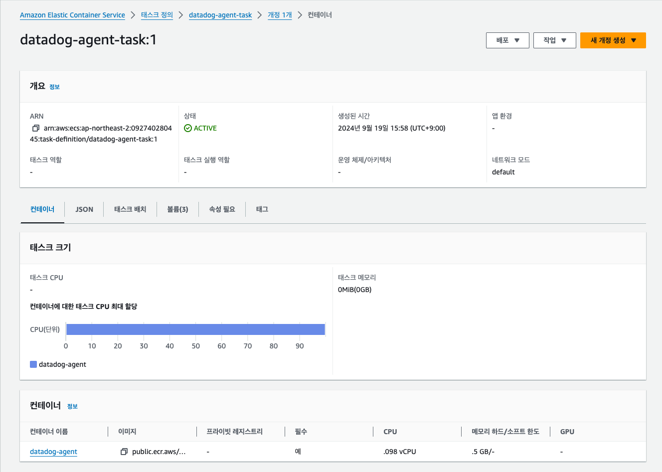 명령어를 통해 ECS task에 DataDog agent를 등록한다.