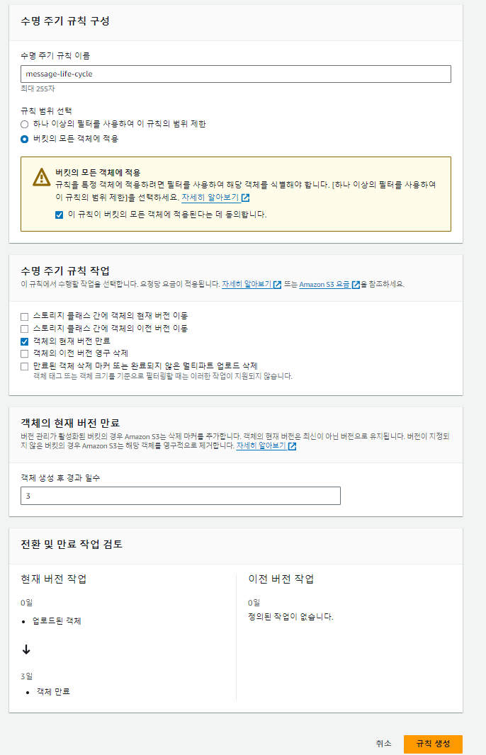 S3 버킷에서 수명주기를 설정하면 SQS에서 메시지 보존 기간만큼 S3에서도 파일을 저장할 수 있다.