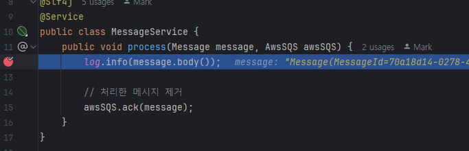 IDE에서 브레이크 포인트로 메시지 처리를 멈추고