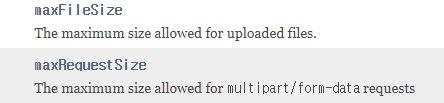공식 문서를 보면 max-file-size는 MultipartFile 1개의 최대 업로드 사이즈, max-request-sizes는 multipart/form-data한 개의 요청의 최대 업로드 사이즈 설정이다.
